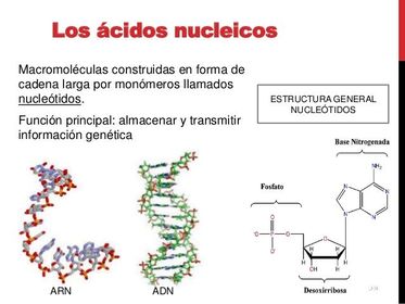 Función: Duplicación del ADN - Expresión del mensaje genético:- Transcripción del ADN para formar ARNm y otros- Traducción, en los ribosomas, del mensaje contenido en el ARNm a proteínas.Propiedades: Desnaturalizacion: capacidad que posee la molécula de separar dos cadenas Reabsorcion: Emparejamiento de las cadenas tras quitar el calor al que son sometidas para la desnaturalizacion Hibridacion: emparejamiento entre cadenas complementarias de origen diferente Características: Los ácidos nucleicos son biomoléculas orgánicas compuestas siempre por C, H, O, N y P.están formados por la repetición de unidades moleculares llamadas nucleótidos. Hay dos tipos de ácidos nucléicos: el ácido ribonucleico (ARN) y el ácido desoxirribonucleico (ADN).