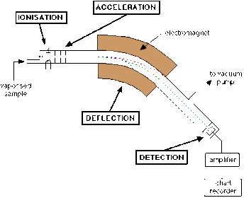The ions are then deflected by a magnetic field according to their masses. The lighter they are, the more they are deflected.The amount of deflection also depends on the number of positive charges on the ion - in other words, on how many electrons were knocked off in the first stage. The more the ion is charged, the more it gets deflected.