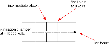 Caption: : The positive ions are repelled away from the very positive ionisation chamber and pass through three slits, the final one of which is at 0 volts. The middle slit carries some intermediate voltage. All the ions are accelerated into a finely focused beam.