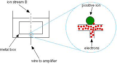 Caption: : When an ion hits the metal box, its charge is neutralised by an electron jumping from the metal on to the ion (right hand diagram). That leaves a space amongst the electrons in the metal, and the electrons in the wire shuffle along to fill it. A flow of electrons in the wire is detected as an electric current which can be amplified and recorded. The more ions arriving, the greater the current.