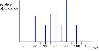 The output from the chart recorder is usually simplified into a "stick diagram". This shows the relative current produced by ions of varying mass/charge ratio.You may find diagrams in which the vertical axis is labelled as either "relative abundance" or "relative intensity". Whichever is used, it means the same thing. The vertical scale is related to the current received by the chart recorder - and so to the number of ions arriving at the detector: the greater the current, the more abundant the ion.As you will see from the diagram, the commonest ion has a mass/charge ratio of 98. Other ions have mass/charge ratios of 92, 94, 95, 96, 97 and 100.That means that molybdenum consists of 7 different isotopes. Assuming that the ions all have a charge of 1+, that means that the masses of the 7 isotopes on the carbon-12 scale are 92, 94, 95, 96, 97, 98 and 100.