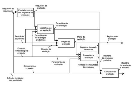 As principais etapas são: -Estabelecimento dos requisitos da avaliação, ondeos requisitos do software são recebidos e os requisitos da avaliação são definidos; -Especificação da Avaliação, onde se utiliza a descrição do produto e os requisitos da avaliação paradefinir o que será contemplado na avaliação; -Projeto da Avaliação, onde se agregam os dados utilizados na etapa anterior ao conhecimento de métodos de avaliação e projeta-se o Plano de Avaliação; -Execução da Avaliação, onde se usam as ferramentas específicas para colocar o Plano de Avaliação em prática; -Conclusão da Avaliação, onde o Relatório de Avaliação é emitido e todos os resultados obtidos são sintetizados e emite-se um parecer ao requisitante da avaliação.