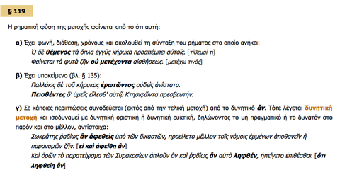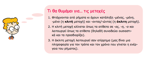 Caption: : Οι υπογραμμισμένες λέξεις είναι μετοχές. Αν παρατηρήσεις καλά τις καταλήξεις, θα δεις ότι μοιάζουν, σαν τύποι, τόσο με τα επίθετα (ως προς τις καταλήξεις) όσο και με τα ρήματα (ρηματικό θέμα - χαρακτήρας). Μπορείς να εντοπίσεις ομοιότητες και διαφορές με τις μετοχές στα νέα ελληνικά;