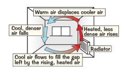 Convection of Heat - Liquids and Gases Only...Convection occurs when the more energetic particles move from the hotter region to the cooler region - and take their heat energy with them. The immersion heater: Heat energy is transferred from the heater coils to the water by conduction. (particle collisions.)The particles near the coils get more energy so they start moving around faster.This means there's more distance between them, i.e. the water expands and becomes less dense. This reduction in density means that hotter water rises above the denser and cooler water. As the hot water rises it displaces the colder water out of the way causing it to sink towards the heating coils. The cold water is then heated by the coils and rises and so it goes on. You end up with convection currents going up, round and down. (Circulating.) CONVECTION CURRENT!