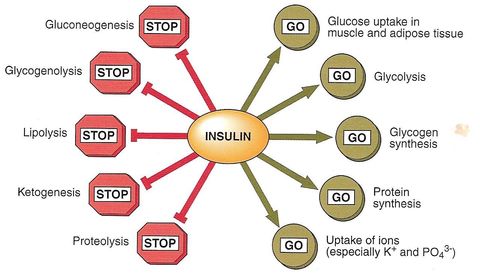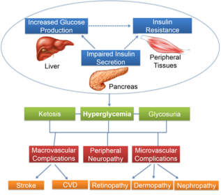 As tissues are not taking up the insulin, the liver continues to produce and secrete glucose → hyperglycemia and glycosuria. Glycosuria occurs because the filtered glucose exceeds the renal threshold → glucose appears in the urine and acts as an osmotic diuretic → frequent urinations and excessive thirst which are the most common symptoms → over time the hyperglycemia damages the blood vessels → macro/microvascualr complications. The main cause of morbidity and mortality in diabetes in the poorly controlled hyperglycemia over a period of years. The damage is irreversible.