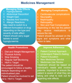 Initial drug treatment- Treatment with a single non‑insulin blood glucose lowering therapy (monotherapy)Metformin OR if contra - DPP-4 Inhibitor or Pioglitazone or SulfonylureaFirst intensification of drug treatment - Treatment with 2 non‑insulin blood glucose lowering therapies in combination (dual therapy)Metformin + DPP-Inhibitor/Pioglitazone/Sulfonylurea OR if contra - DPP-4 + Pioglitazone/Sulfonylurea or Pioglitazone + Sulfonylurea Second intensification of drug treatment - Treatment with either 3 non‑insulin blood glucose lowering therapies in combination (triple therapy) or any treatment combination containing insulinMetformin + DPP-4 Inhibitor + sulfonylurea or Metformin + Pioglitazone + Sulfonylurea + Insulin
