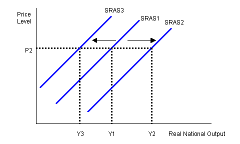 Aggregate supply (AS) measures the volume of goods and services produced each year. AS represents the ability of an economy to deliver goods and services to deliver this demand. Short run AS (SRAS) shows total planned output when prices can change, but the prices and productivity of factor inputs are held constant. It is an upward sloping curve.Causes for shifts in the AS curve are: