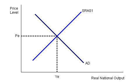 Macroeconomic equilibrium is when AD intersects with SRAS. If the general price level is too high, there will be an excess supply of output and producers will have unsold stocks and will cut back on production. If the price level is above equilibrium, there is excess demand in the short run so businesses should expand output. For an economy to be in equilibrium, total demand for goods and services is close to the actual level of production.Increase in AD (right shift) causes a cyclical increase to employment and output. The price level will increase and GDP will increase. An increase in SRAS (left shift) causes expansion of AD and higher equilibrium level of national output causing more GDP and inflation will fallA fall in AD (left shift) causes lower equilibrium level of national output, a decrease in inflation and a decrease in real GDP. A fall in SRAS (right shift) due to higher production costs, causes contraction of AD, lower equilibrium of national output, an increase in inflation and a decrease in real GDP.