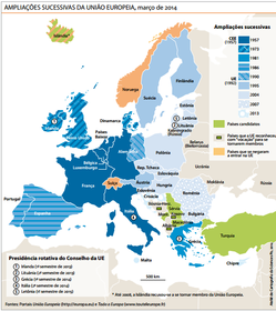A idéia de criar um espaço europeu integrado surgiram no continente logo após a Segunda Guerra Mundial, com a criação do Benelux (1944) que incluia Bélgica, Holanda e Luxemburgo, e a Comunidade Econômica do Aço (Ceca), em 1951, com a França, Itália, Alemanha Ocidental e países do Benelux.A integração surgiu e se consolidou na Europa como forma de superar rivalidades históricas e buscar estabilidade política.Desse modo, a ideia de um grande espaço interno de livre circulação de bens, pessoas, capitais e informações, e sem restrições no trânsito entre as fronteiras dos países-membros, criaria maior interdependência e reciprocidade, afastando a possibilidade de novas guerras e disputas.Nesse contexto, foram criadas as bases para a assinatura do Tratado Roma, em 1957, formando a Comunidade Econômica Europeia (CEE), ao longo dos anos outros países foram se integrando ao bloco até chegar aos atuais 28 países. O último a ingressar foi a Croácia, em 2013. O mapa ao lado mostra as adesões que ocorreram até 2014, o tom azul mostra a ordem cronológica das sucessivas adesões ao bloco. http://goo.gl/pR0bss (acesse o mapa em tamanho maior)
