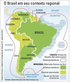Caption: : O mapa acima localiza os países do Mercosul, Estados associados
