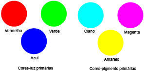 1) Cores primáriasSão cores que não podem ser decompostas e que através delas são criadas todas as outras cores.Cores-luz primárias: vermelho, verde e azulCores-pigmento primárias: ciano, magenta e amarelo.