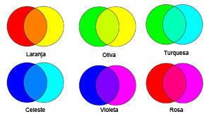 3) Cores terciáriasSão cores obtidas pela mistura de uma primária e uma secundária. São ao todo seis, independentes da síntese: laranja, oliva, turquesa, celeste, violeta e rosa