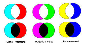 Obs1: As cores secundárias de um sistema resultam nas primárias de outro.Obs2: Aqui vemos que na cor-pigmento o vermelho e o azul vêm do ciano e do magenta, logo, são cores secundárias e não primárias.