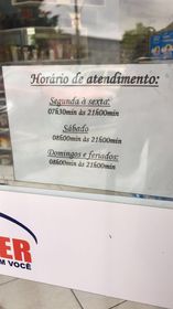 Original(errado)"Segunda à sexta: 07h:30min às 21h:00min"."Sábado: 08h:00min às 21h:00"."Domingos e feriados: 08h:00min às 21h:00min".*Nos dias de semana não vai acento crase, pois os dias são precedidos apenas por preposições sem nenhum artigo. Os horários são precedidos por acento crase pois indicam tempo.Forma correta:"Segunda a sexta: 07h:30min às 21h:00min"."Sábado: 08h:00min às 21h:00"."Domingos e feriados: 08h:00min às 21h:00min".