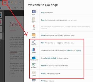 Learning is a much more effective experience when done in a social and collaborative way. For this reason, GoConqr has numerous functions so you can invite your classmates or colleagues, create a learning group and share your knowledge and resources.GoConqr Groups are a learning environment in which to discuss topics, conduct polls, and share materials with others interested in the same topics as you. You can request to join public groups, or create private groups for your friends.All the resources created with GoConqr can be shared both inside and outside the platform. So you can easily embed a resource in a blog or website, or share via social media. Simply click on the actions button (folder+cog), when you are in edit mode.