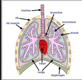 Breathing is when muscles change the volume of chest. Ventilation is the movement of air in and out of lungs. Lungs collect oxygen from the air and delivers Co₂ to the air and so lungs need a large moist surface area for exchange of gases to take place; a good blood supply and circulatory system to move things around the body; ways to prevent the surfaces being clogged up with dust from the air. Alveoli are very good at exchanging gases because they have walls one cel thick; they give lungs a large surface area, they are surrounded by lots of capillaries. Mucus traps dust and microbes. Cilia (tinyh= hairs) sweep mucus out of bronchi and trachea. Chemicals and heat from smoking stop cilia from working. Then mucas collects and reduces surface area for gas change. Smoking can also cause alveoli to breakdown.