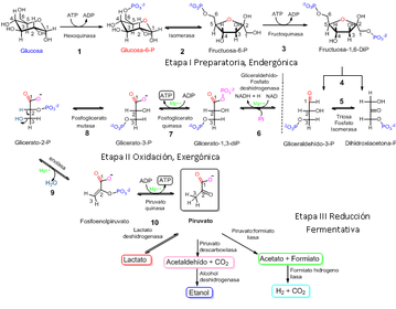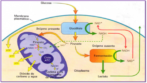 citoplasma*Aeróbica* El piruvato se convierte en AcCoA (acetil-Coenzima A)* Se forma un ácido carboxílico* Se separan y oxidan los carbonos