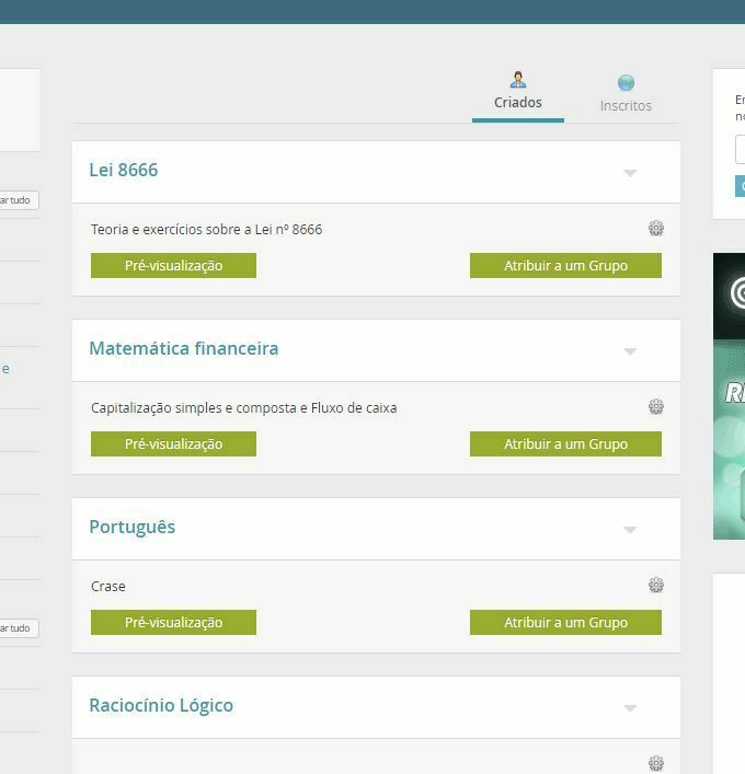 Na lateral esquerda da sua página inicial, você encontra a opção de Cursos, para criar ou acessar os cursos que você está fazendo em GoConqr.Professores podem criar Cursos para compartilhar nos Grupos com seus alunos. Basta clicar em "Criar Curso" e agrupar recursos criados em GoConqr. Você pode selecionar a data e o horário para início do curso e selecionar a opção de visualização sequencial do curso.Dessa forma, você compartilha conteúdo de forma estruturada para cada turma.PS: você precisa ser o autor do curso e administrador do Grupo para compartilhá-lo. Para acessar o relatório de desempenho dos alunos e outros funcionalidades exclusivas para professores clique em: GoConqr Campus.