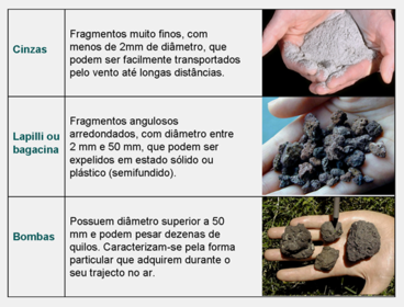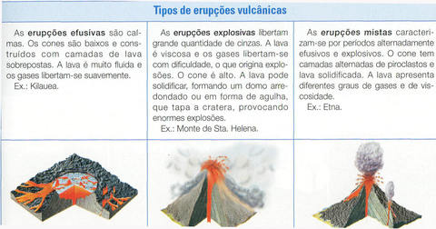 Tipo de erupção/Gases e PiroclastosEfusiva/facilidade em libertar gases e pouca libertação de piroclastos.Explosiva/dificuldade em libertar gases e muita libertação de piroclastos.Mista/períodos semelhantes ao efusivo e outros ao explosivo.