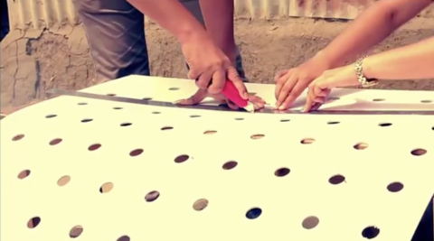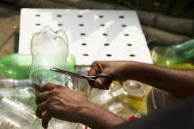 Após preparar a placa do papelão, deve-se preparar as garrafas pets a serem utilizadas em cada buraco no papelão.Todas elas devem ter a parte inferior cortadas e deve-se retirar, aproximadamente, quatro dedos do fundo.