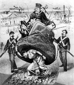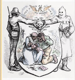 1. What is happening to the woman in the cartoon?2. What is the woman a symbol of?3. Describe the condition of the south from the background scenes?4. Why does the woman appear to be struggling?5. Is the cartoonist criticizng Radical Reconstruction or defending it? Why?
