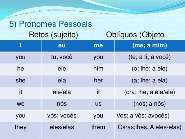 I = EU YOU = VOCÊ HE = ELE SHE = ELA IT = ISSO, ELE, ELA, AO SE REFERIR A ANIMAL OU COISA YOU = VOCÊS WE = NÓS THEY = ELES, ELAS