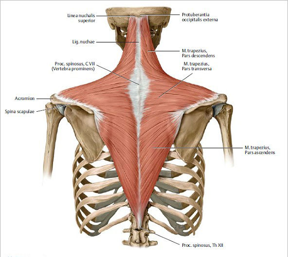 M. trapezius 1) Pars descendens 2) Pars transversa 3) Pars ascendens | U: 1) Protuberantia occipitalis ext.; Processus spinosi |