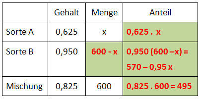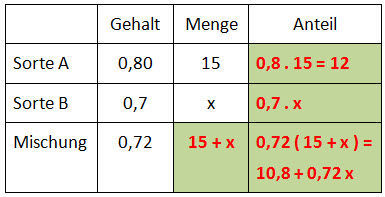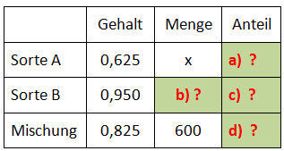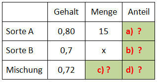| Mischungsaufgabe: 12 Liter einer 40%igen Lösung 20 Liter einer 60%igen Lösung? a) Wie viele Liter hat die Mischung b) Liegt der Prozentsatz der Mischung näher bei 40 oder bei 60? | a) die Mischung hat 32 Liter b) näher bei 60% Begründung: ich verwende mehr von der 60%igen Mischung, daher wird der Prozentsatz der Mischung zwischen 50 und 60 liegen. |
