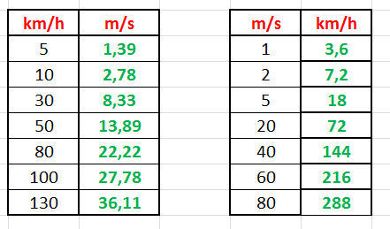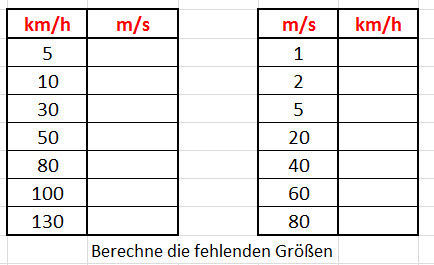 | Wenn ich m/sec in km/h umrechne. Wie gehe ich vor? z. B. 20 m/sec | Ich muss 20 km/h mit 3,6 multiplizieren! 20 . 3,6 = 72 km/h |