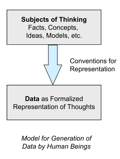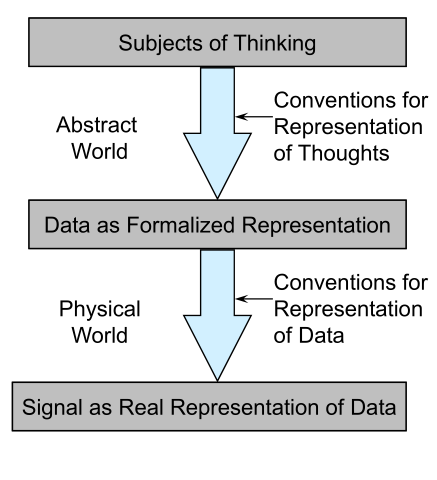 | Data (universal) | Representation of facts, concepts, ideas and instructions in a formalized manner, that is suitable for communication, interpretation and processing through human beings and/or technical devices |