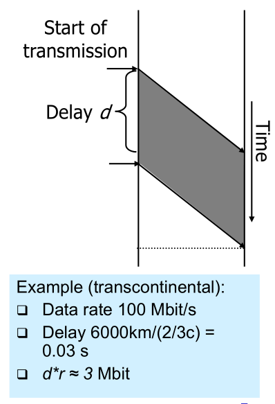 | What happens in the first 'd' seconds after transmission starts? Where are the bits? | - Bits are transmitted and propagate towards the receiver - Sender keeps sending bits - First bit arrives after 'd' seconds - In this time, sender has transmitted 'd * r' bits - the bits are stored in the wire |