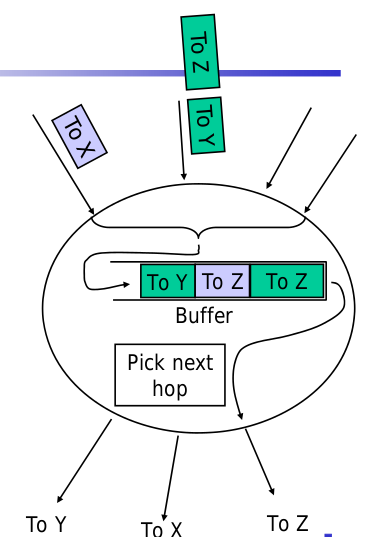 | Packet Switching: Switches additional tasks? | - receive a complete packet - store the packet in a buffer - find out the packet's destination *forward* the packet to this next hop towards its destination (like the post office does it) => store-and-forward network |