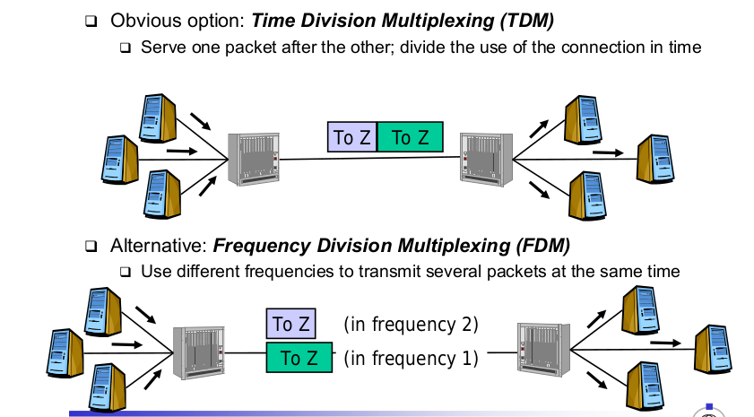 | Multiplexing | - multiple sender, send to the swtich (multiplexer) which then organizes the forwarding packets over such a single, shared connection - multiplexeres in general need buffer space as well |