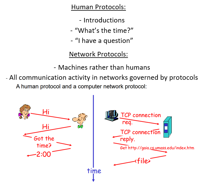 | What's a Protocol? | - Specific messages are sent - Specific actions are taken when messages received, or other events Protocols define: - format - order of messages sent - received among network entities - actions taken on message transmission and receipt |