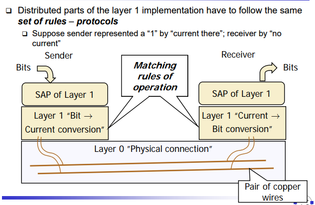 | Bit Transmission Layer (Example) | SEND_BIT - sender can ask for the delivery of a bit to the receiver RECEIVE_BIT - receiver can wait for the arrival of a bit (blocking) INDICATE_BIT - indicate to the receive that bit is now available (asynchronous) |
