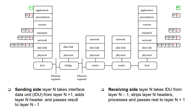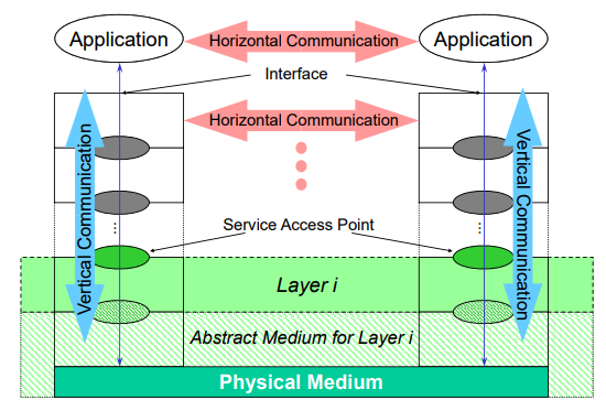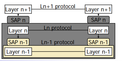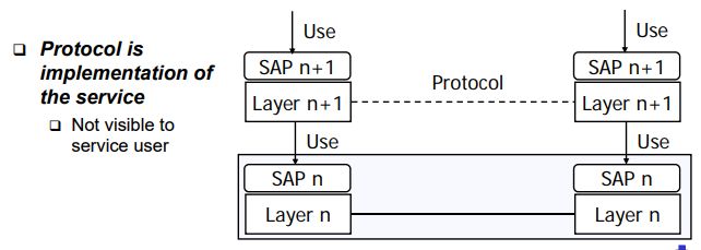 | Services (layers) | - expose a well defined interface to higher layers - are accessible at their Service Access Point (SAP) - is a promise what is going to happen to data when delivered to SAP |