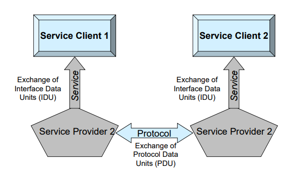 | Protocols - peer protocol entities / peers | - remote parts that cooperate to implement the service of a given layer |