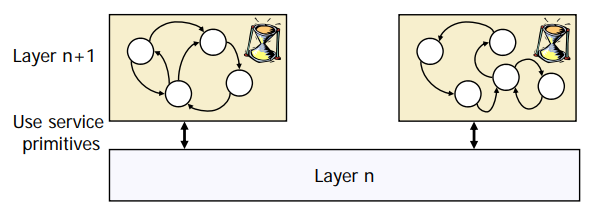 | Protocols and FSMs - Communication Finite state machines to remote peer | - can't communicate directly -> have to use service of underlying communication layer -> via service primitives, which can also provide arriving data to the protocol |