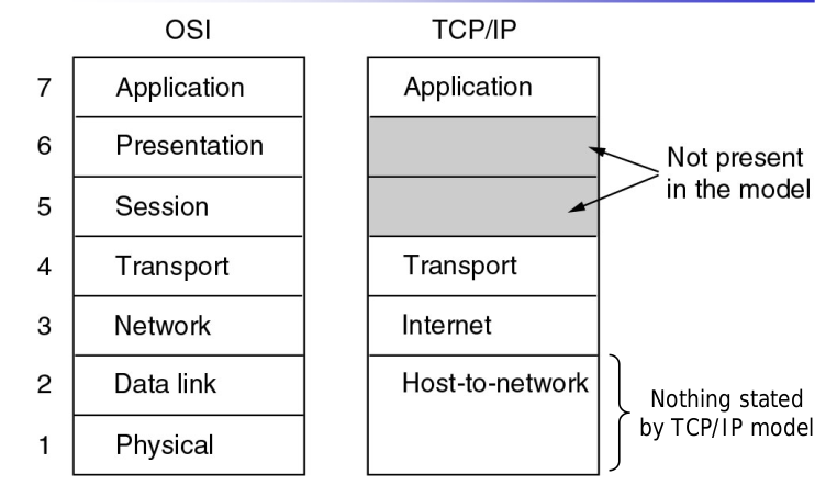| ISO/OSI Reference Model - 7-layer model | - not strictly speaking an architecture, because protocol details are not specified - only general duties of each layer are defined |