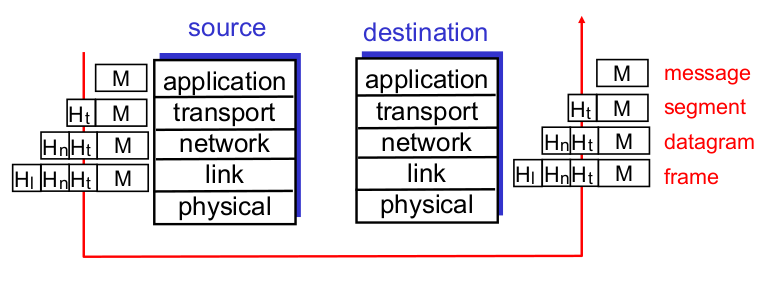 | Protocol Layering and Data in the Internet | - Each layer takes data from (layer) above -> adds header information to create new data unit -> passes new data unit to layer below |