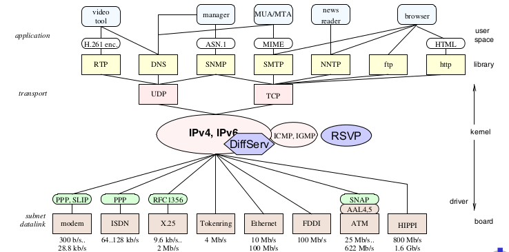 | TCP/IP Suite of Protocols | - Many application specific protocols over IP - IP (with best effort service model) over many media specific (L2) protocols -> "Hourglass" model of IP - Quality of Service added to IP as an "afterthought" |