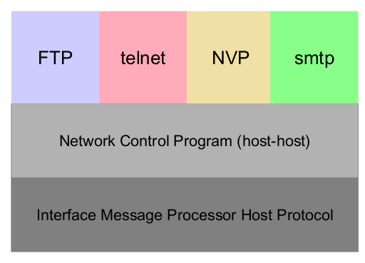 | ARPANet: Protocols and Stack | - IMP-Host Interface: defiend by BBN Report 1822 - Communication Service: -> Reliable delivery to a specified host system of a message of arbitrary bit length --> I.E. a "reliable datagram" service -> The 8-bit byte not universal yet; computers used 8,12,16,18,24,32,36,48,... bit words -> ARPAnet host addresses were 24 bit |
