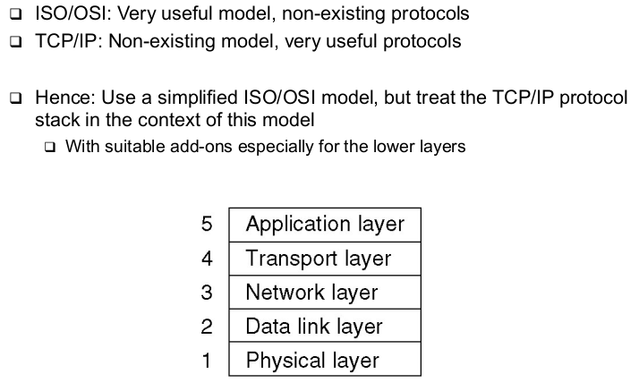 | ISO/OSI Reference Model - Critique | - very influential until today, in its structuring of functions into layers - actual protocols developed for it are irrelevant in practive - ISO gaining market acceptance for its model - in the Internet protocol model, the upper three OSI layers are summarized in one (Internet-) application layer |