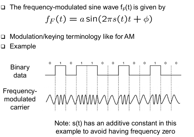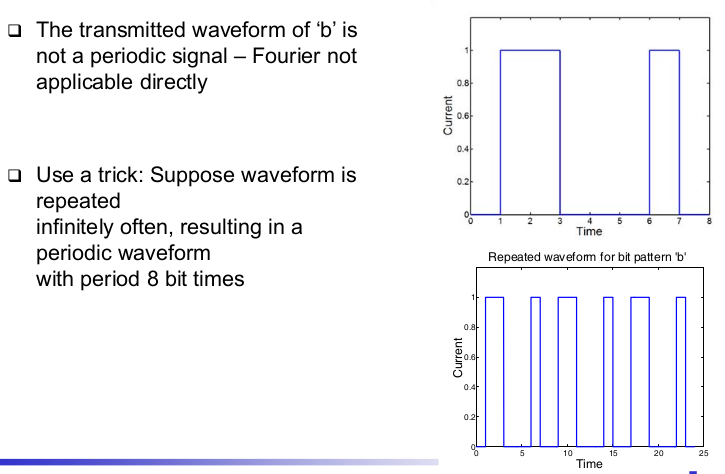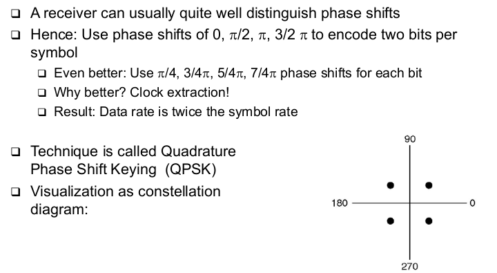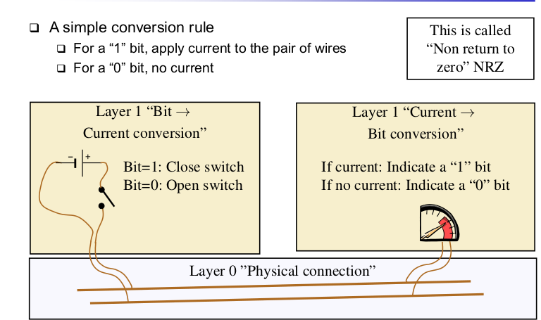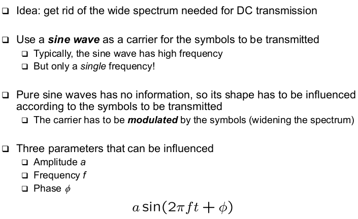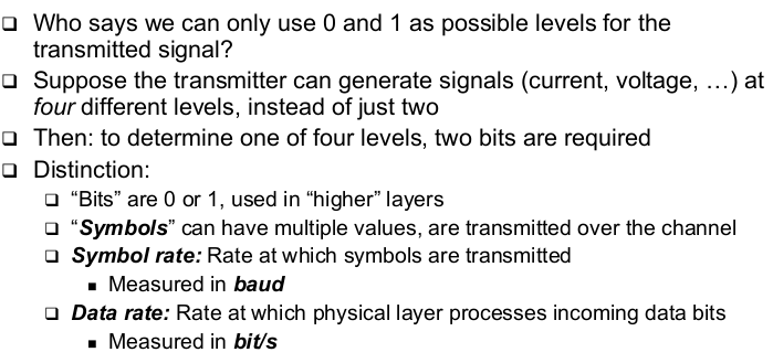 | Baseband versus Broadband Transmission (Baseband transmission) | - directly puts the digital symbol sequences onto the wirse - at different levels of current, voltage, ... essentially, direct current (DC) is used for signaling |