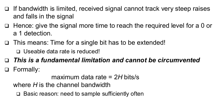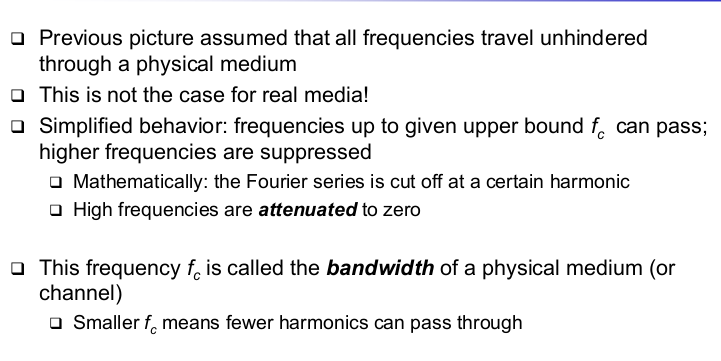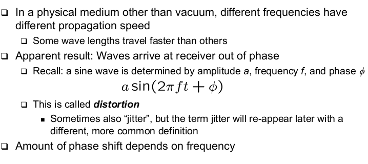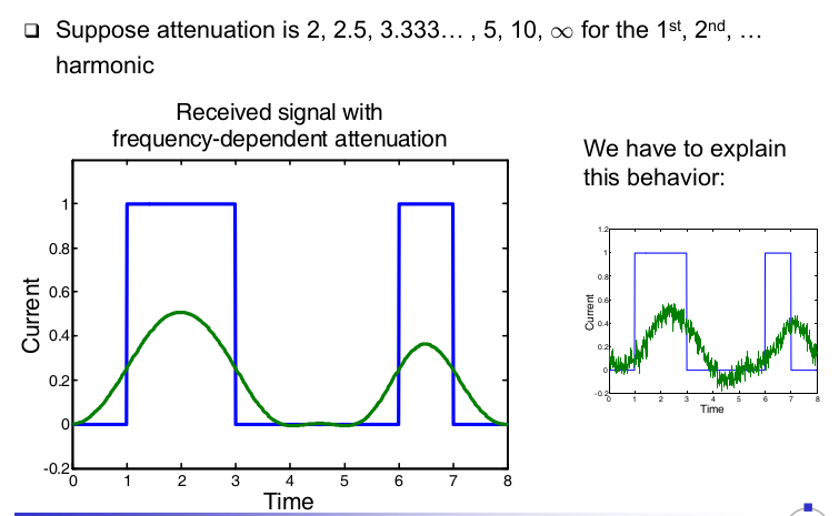 | Baseband versus Broadband Transmission (Baseband transmission - Problems) | - limited bandwidth reshapes the signal at receiver - attenuation and sitortion depend on frequency and baseband transmissions have many different frequencies because of their wide Fourier spectrum |