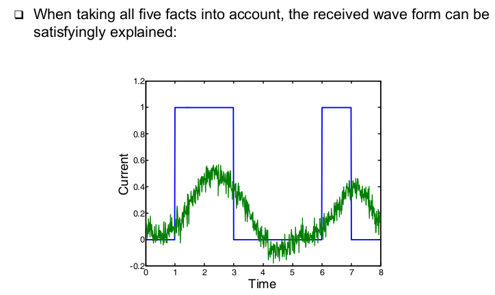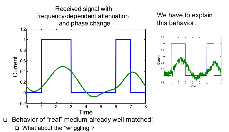 | Fact 5: Real Media are Noisy | - A physical medium, in combination with the receiver, exhibits random (thermal) noise -> Fluctations in the receiver circuitry, interference from nearby transmissions, etc. - Materializes as random fluctuations around the (noise-free) received signal -> Typical model: noise as a Gaussian random variable of zero mean, uncorrelated in time -> More sophisticated model exists |