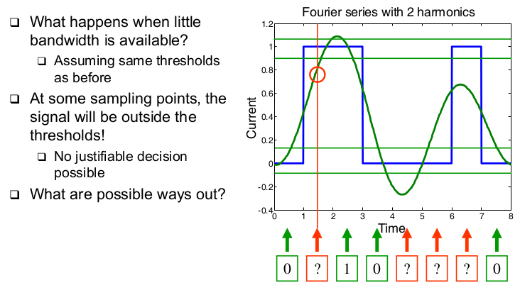 | When to Sample the Received Signal? - How does the receiver know WHEN to check the received signal for its value? | - One typical convention: in the middle of each symbol - But when does a symbol start? -> The length of a symbol is usually known by convention via the symbol rate |