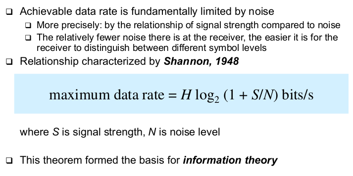| Unlimited Data Rate with Many Symbol Levels? | - Nyquist's theorem appears to indicate that unlimited data rate can be archived when only enough symbol levels are used - is this plausible? - more and more symbol levels have to be spaced closer and closer together - what then about noise? -> even small random noise would then result in one symbol being misinterpreted for another - So not unlimited? |