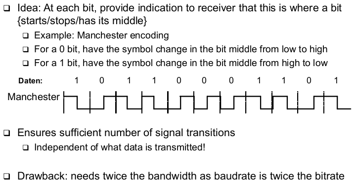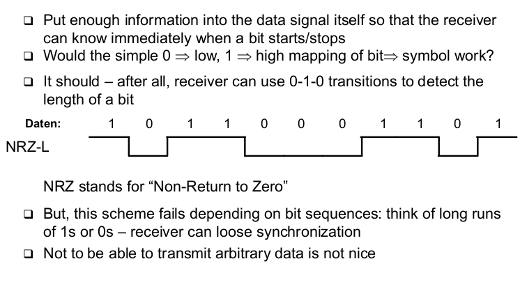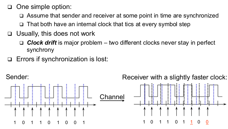 | Options to Tell the Receiver when to Sample (1 - Clock) | - Rely on clock synchonization does not work - Provide and explicit clock signal -> needs parallel transmission over some additional channel -> must be in sync with the actual data, otherwise pointless => usefull only for short-range communication |