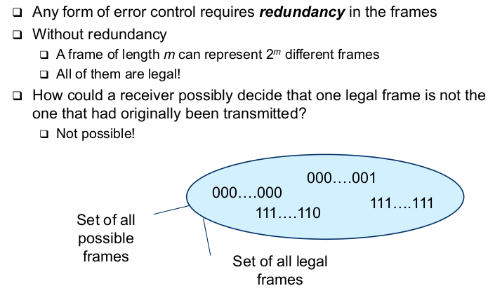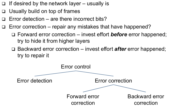 | Error Control (basic aspects) | - Detect the presence of errors (incorrectly received bits) in a frame - Correct error frames |
